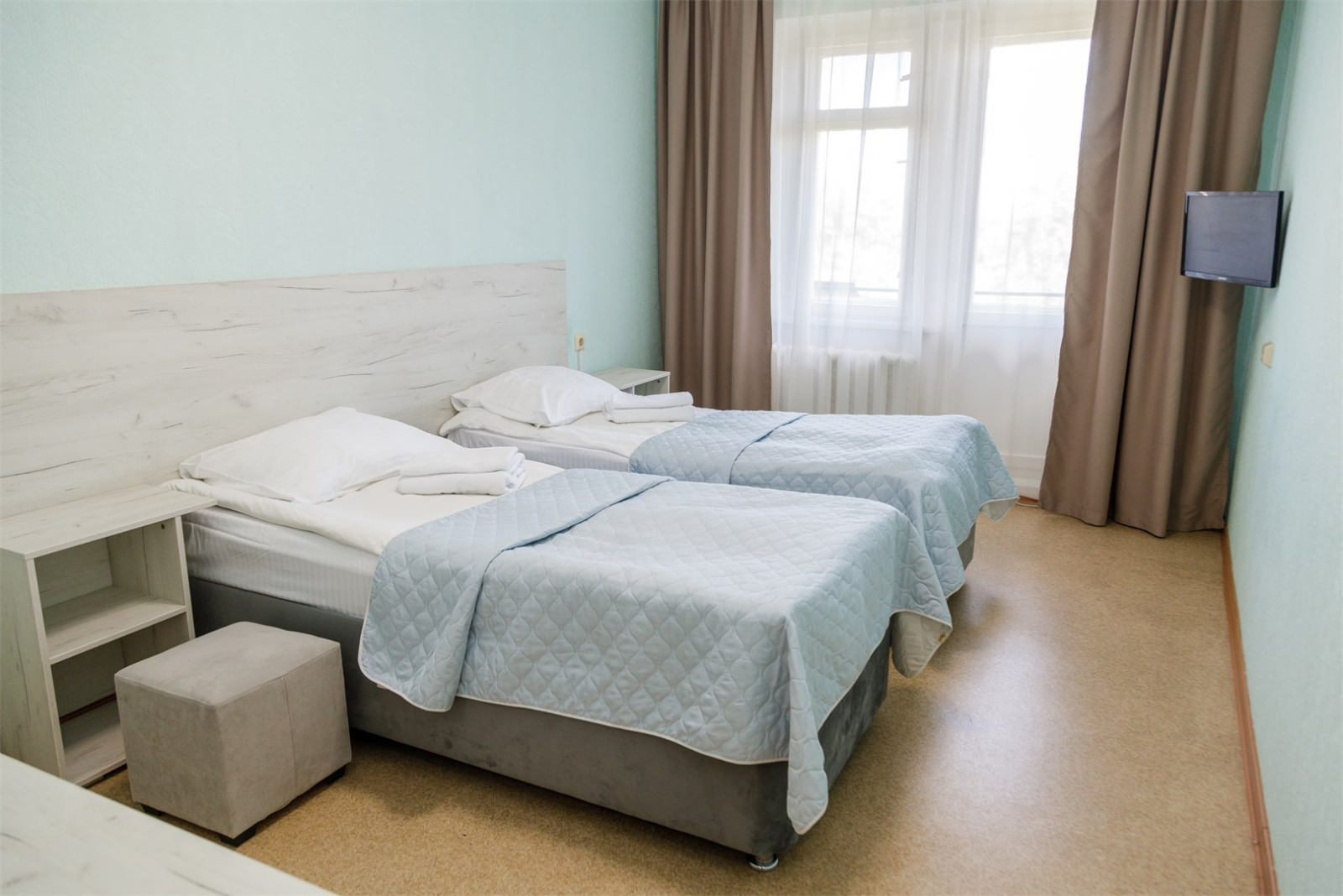 Площадь номера - 13,8 кв.м. 2 осн. места. 1 доп. место. Балкон. Мебель: вешалка, зеркало, кровати односпальные, прикроватные тумбочки, стол, стулья, шкаф. Оборудование: телевизор, холодильник. Санузел. Сервис: Wi-Fi бесплатно, смена полотенец, смена постельного белья, уборка номера.